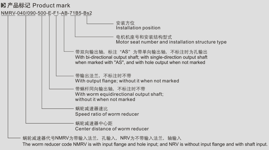 MB無(wú)級(jí)變速機(jī)標(biāo)記有:NMRV-040/090-500-E-F1-AB-71B5-Bs2